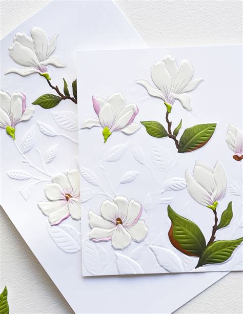Embossing is a technique where raised or recessed designs are created on a surface, adding texture and dimension to the project. The Magnolia Embossing Folder enables crafters to achieve a beautiful magnolia pattern effortlessly. By running the folder through a compatible embossing machine, the design is pressed onto the material, leaving behind an intricate and detailed impression of magnolia flowers and leaves.